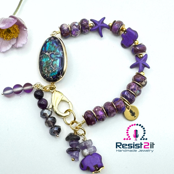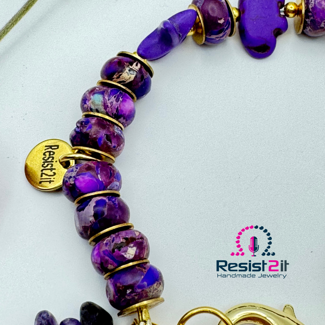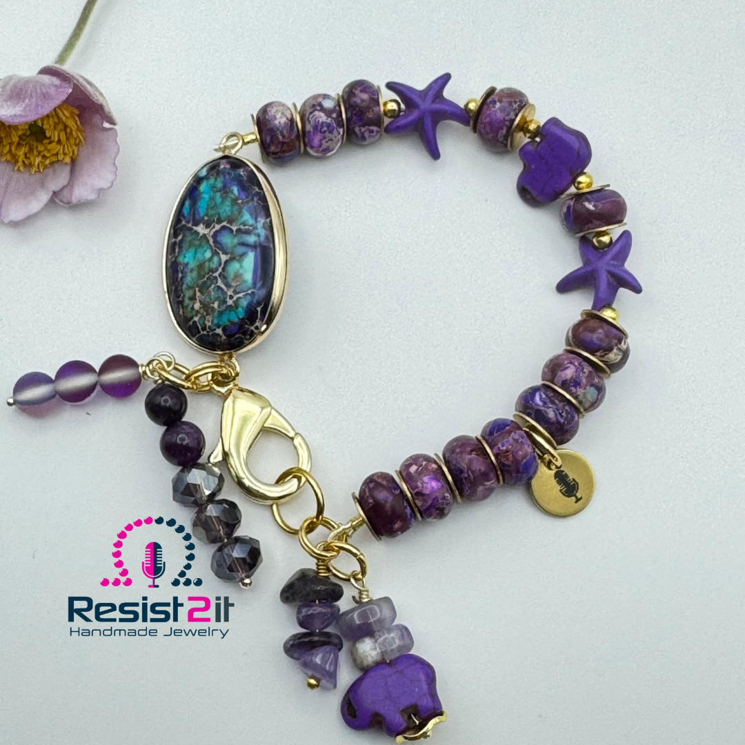 Beautiful purple rondelle beads, gold filled lobster clasp, and a colorful connector.