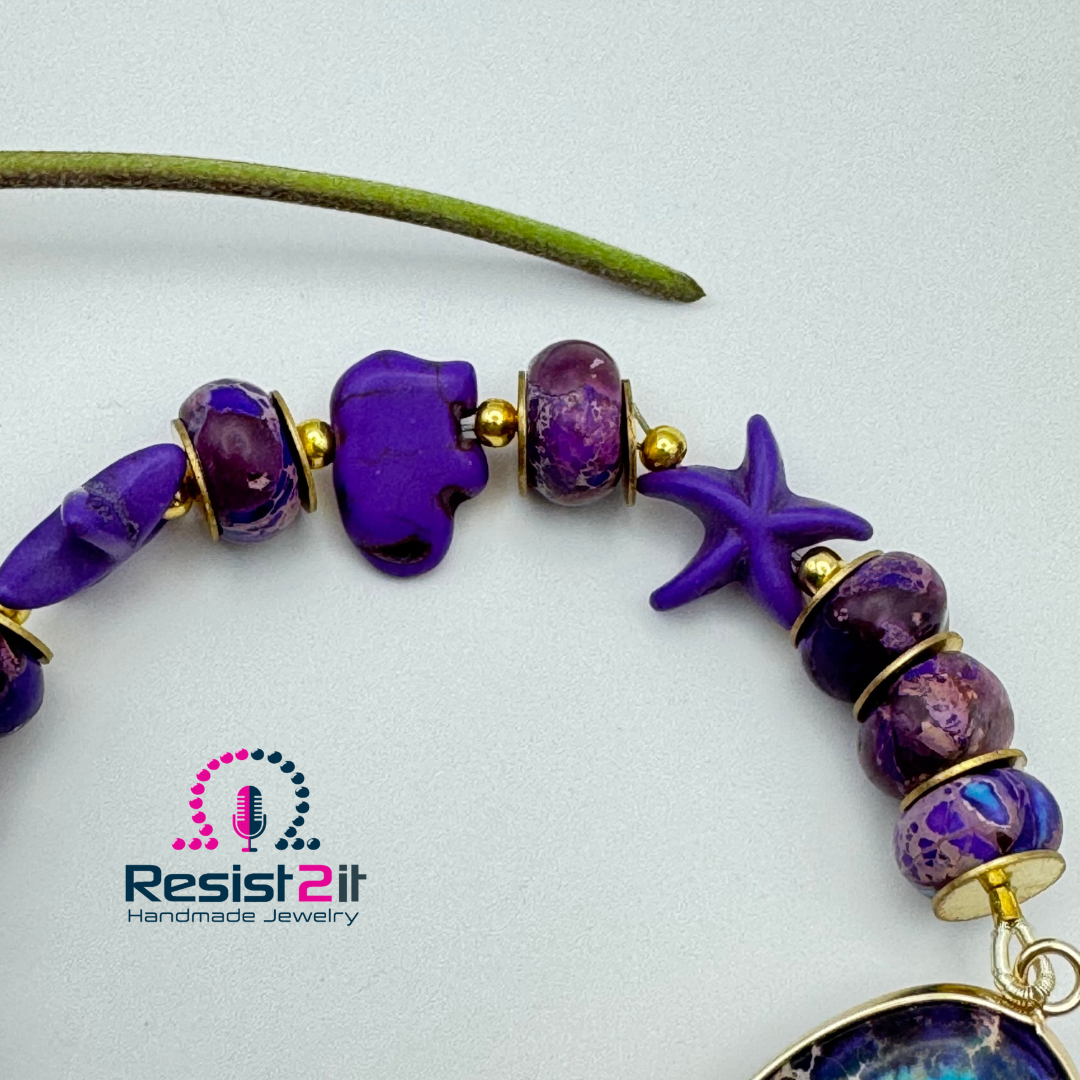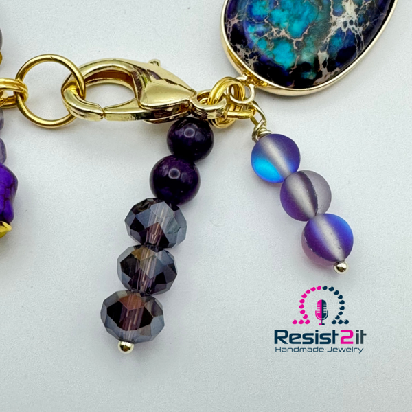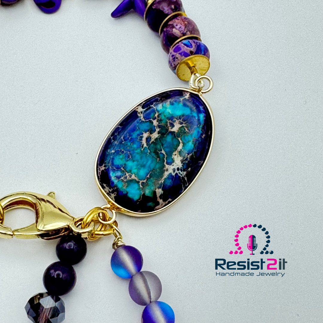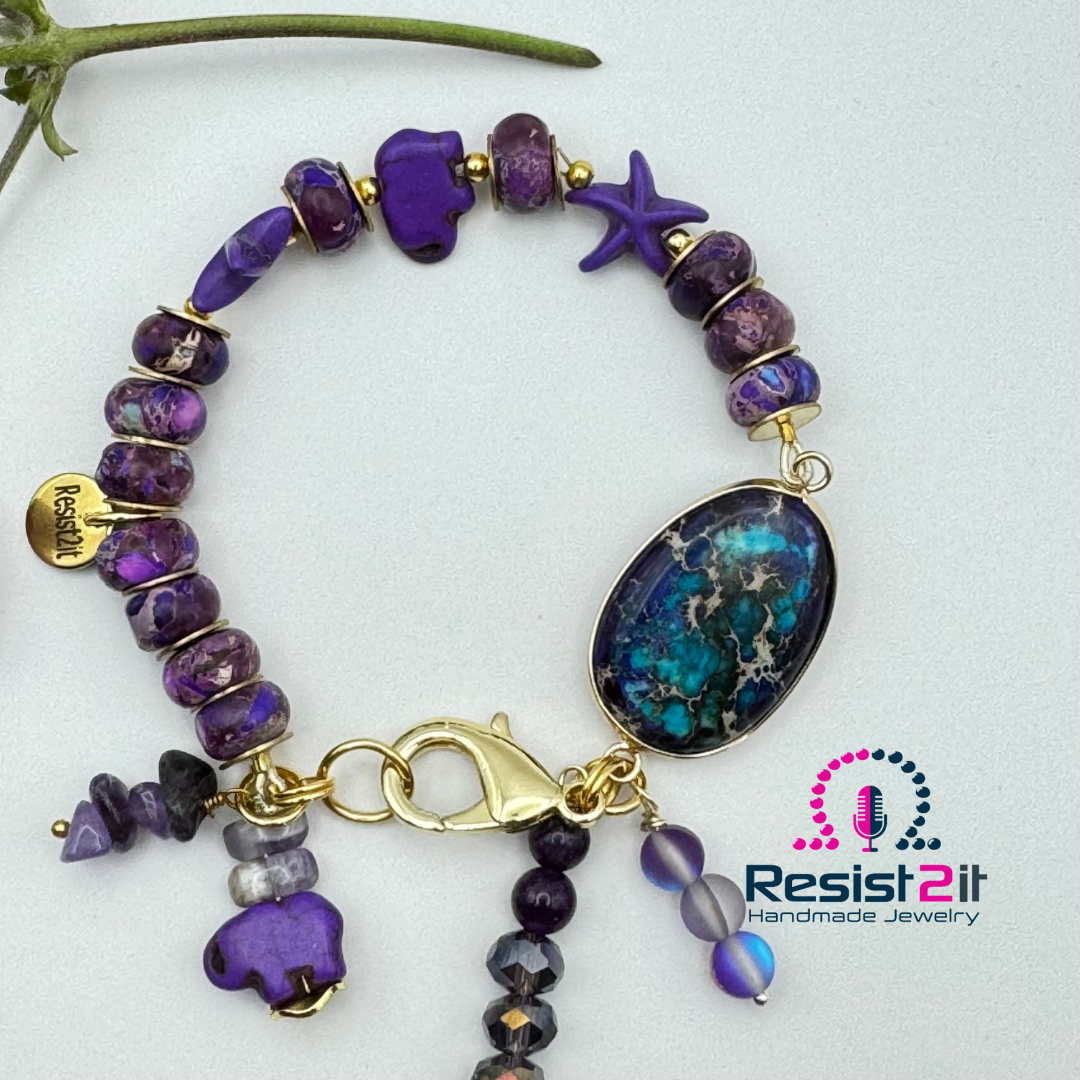 Beautiful purple rondelle beads, gold filled lobster clasp, and a colorful connector.